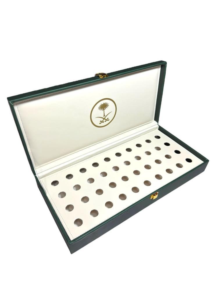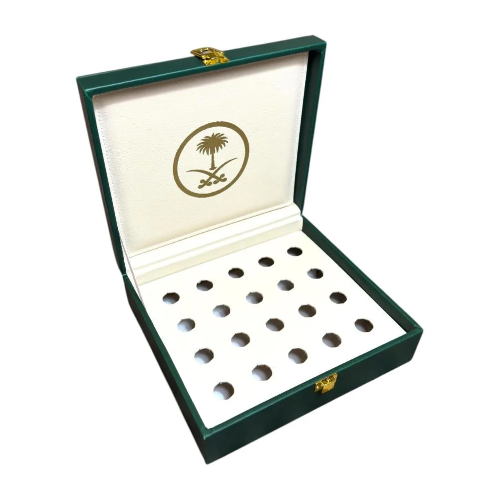 شنطة مميزة مصنوعة من الجلد الإيطالي الفاخر بتصميم أنيق وشعار المملكة الذهبي، مخصصة لحفظ أرباع دهن العود بطريقة عملية وآمنة. تعتبر خيارًا مثاليًا للاقتناء الشخصي أو لتقديمها كهدية راقية تعكس الفخامة والأصالة.